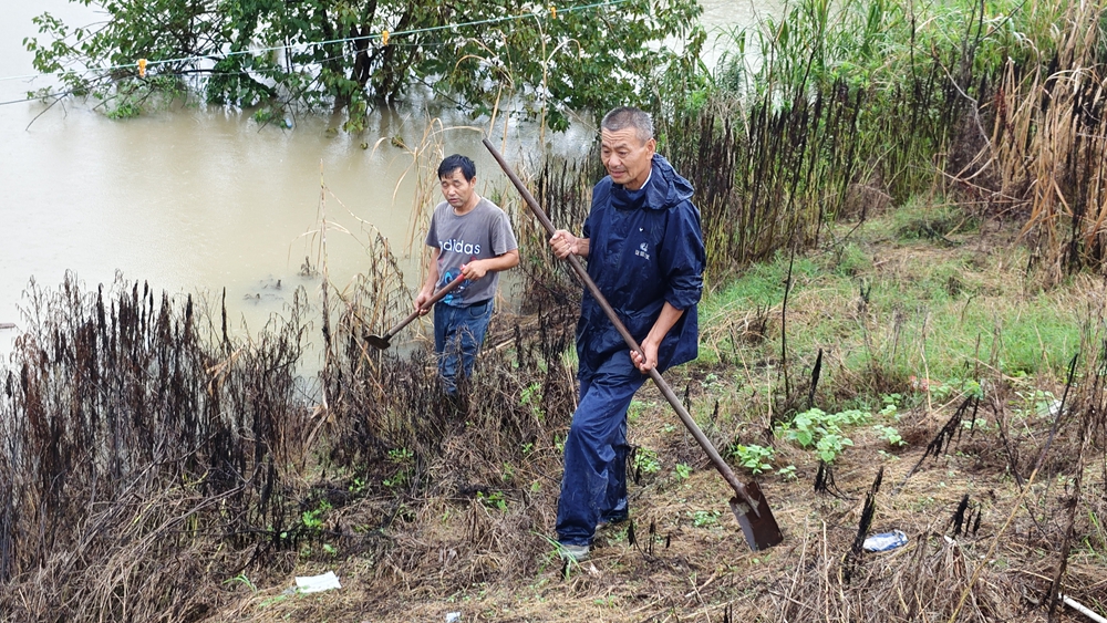 茶业集团防汛人员在巡堤查险。俞小龙 摄