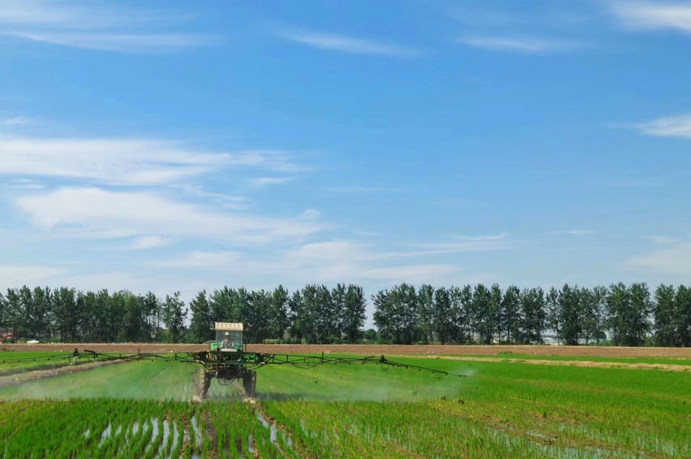 7月7日,方邱湖农场公司生产二部在水稻分蘖期喷施生物酶叶面肥。李莉 摄