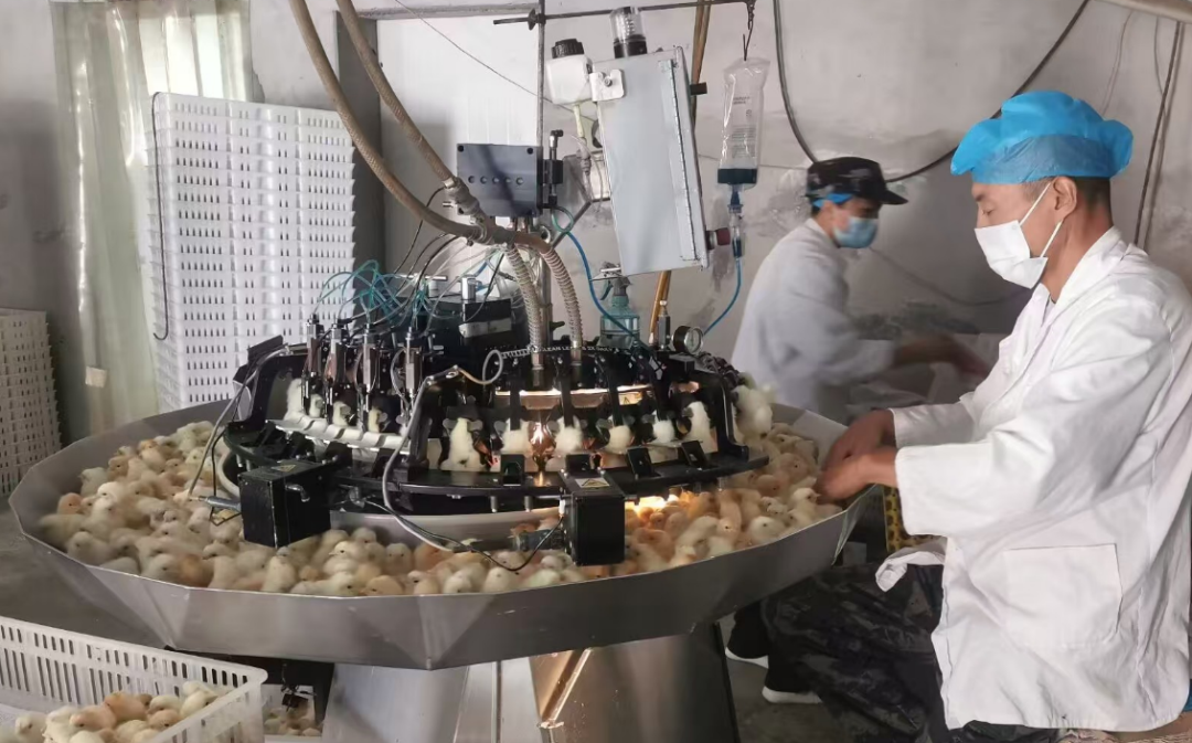 2月11日,安禽禽业公司孵化厅内,工人正紧张有序的挑选鸡苗、注射疫苗、装箱,这是今年春节后第一批发往江苏泰州的京红苗鸡。