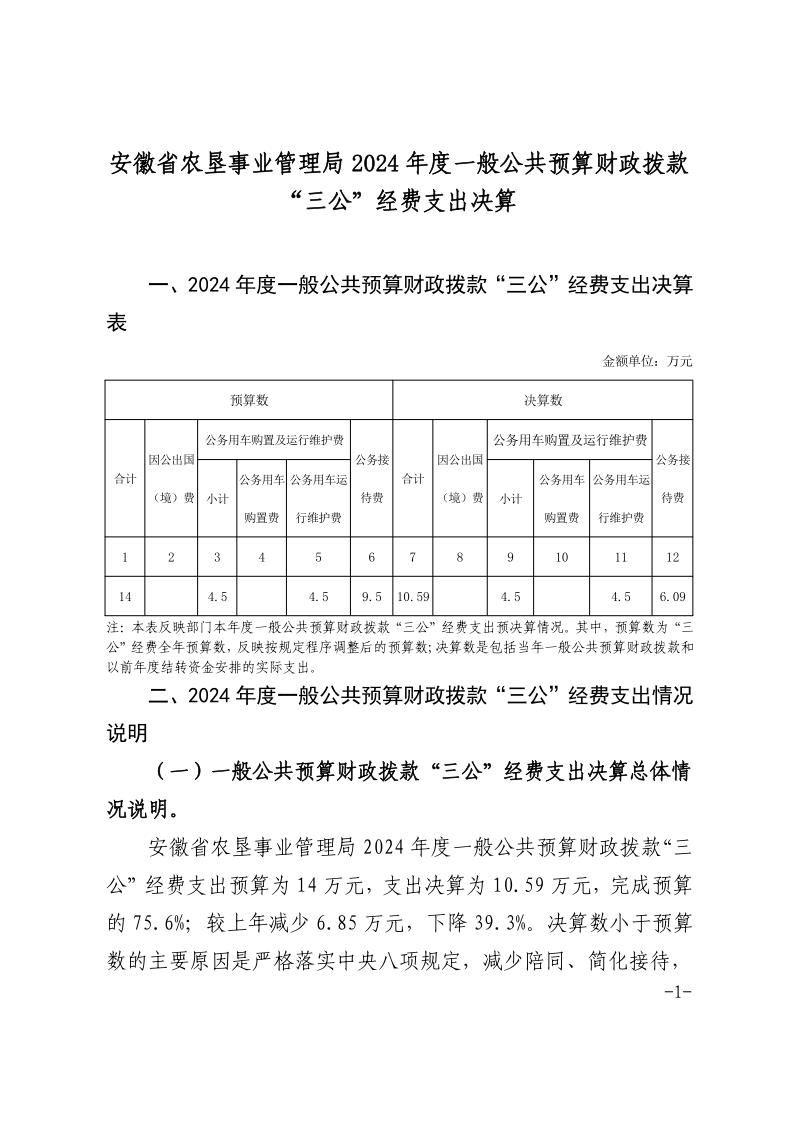 安徽省农垦事业管理局2024年度一般公共预算财政拨款“三公”经费支出决算